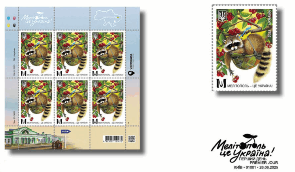 На поштовій марці зображено легендарну мелітопольську черешню та славнозвісного єнота з херсонського зоопарку – як символи того, що українці завжди повертають своє: і вкрадені території, і вкрадених тварин.