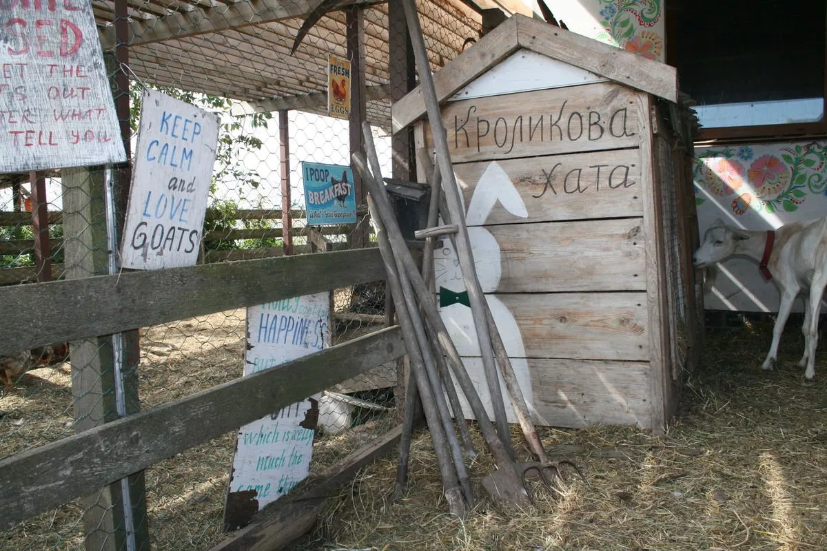 Будинок для кіз господиня прикрасила петриківським розписом. Навколо облаштовано три зони: подвір’я з фруктовими деревами й альтанкою, поле з пшеницею та лісова частина із соснами й туями.