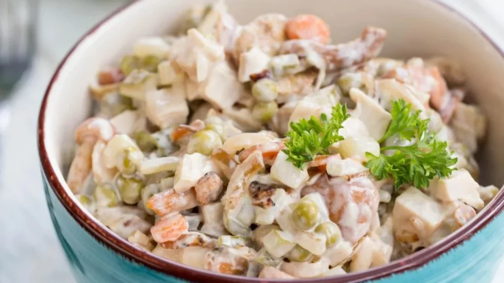 Для повсякденного варіанту просто перемішай усі інгредієнти з майонезом або сметанним соусом. Прикрась зеленню.